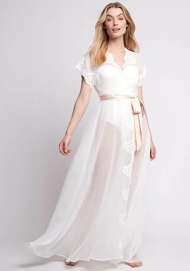And for the bride? A romantic bridal robe is the perfect getting ready option. Our Farrah Long Lace Chiffon Robe is straight out of a pre-wedding fashion fairy tale with dreamy details like the semi-sheer white chiffon fabrication adorned with lace rosettes and featuring lace-cuffed sleeves. This floaty bridal robe is our most pinned bridal robe ever and is the perfect piece to add to your wedding day wardrobe.
