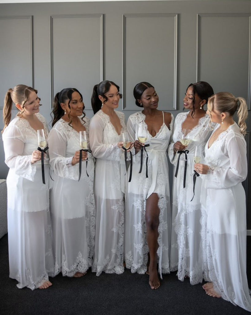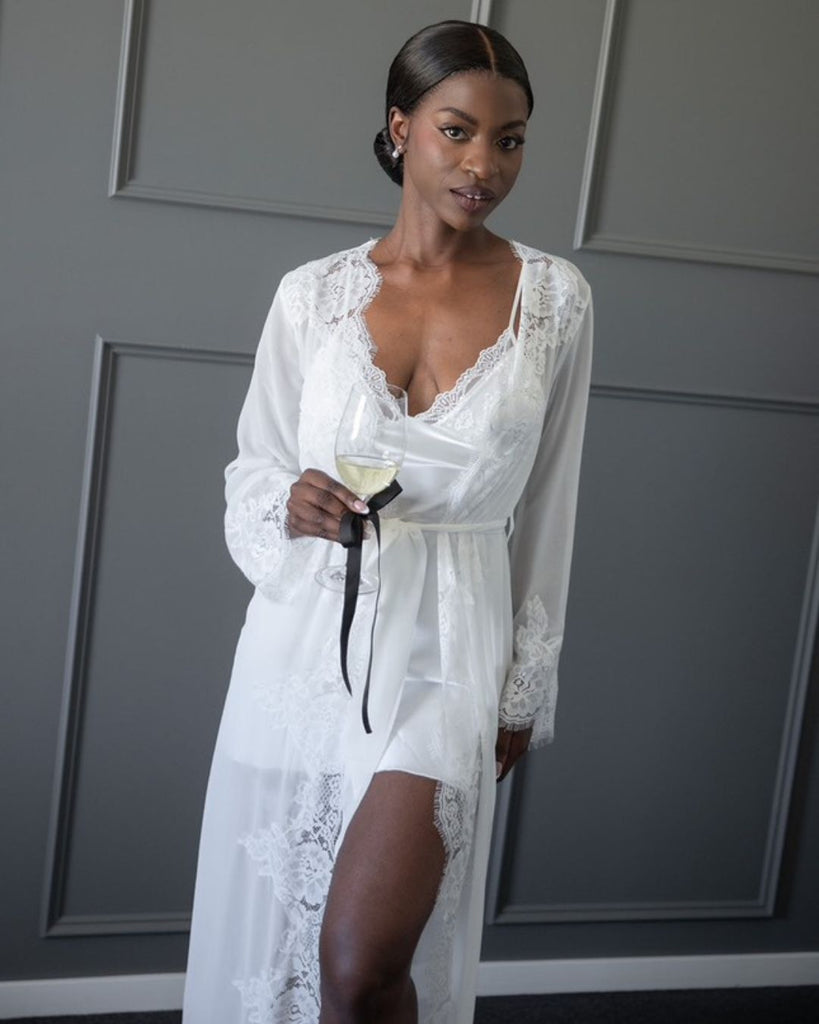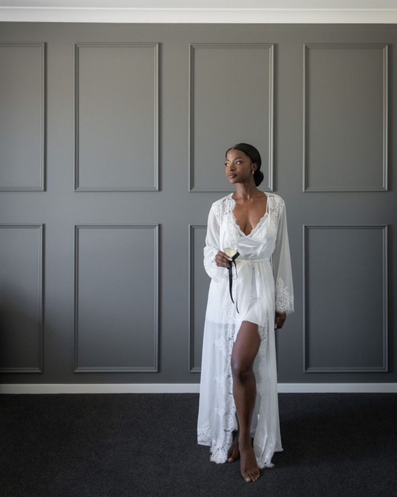 A favourite among brides worldwide, the Helena makes an unforgettable bridal robe — the ideal choice for wedding mornings, pre-ceremony photos, or simply adding a touch of luxury to your getting-ready ritual. The long, flowing silhouette drapes beautifully, while the exclusive lace detailing reflects Homebodii’s dedication to artistry and craftsmanship.
