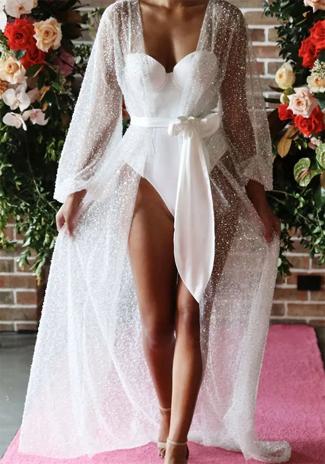 For all out show-stopping getting-ready bridal glamour look to our Athena Luxury Beaded Bridal Robe. This luxurious bridal robe features sparkling beaded and sequin details in a floor-length design replete with a small train and white satin robe. You’ll feel like a Hollywood movie star wearing this on the morning of your wedding. It’s also perfect to wear over your bikini for pool or beachside lounging during your honeymoon.
