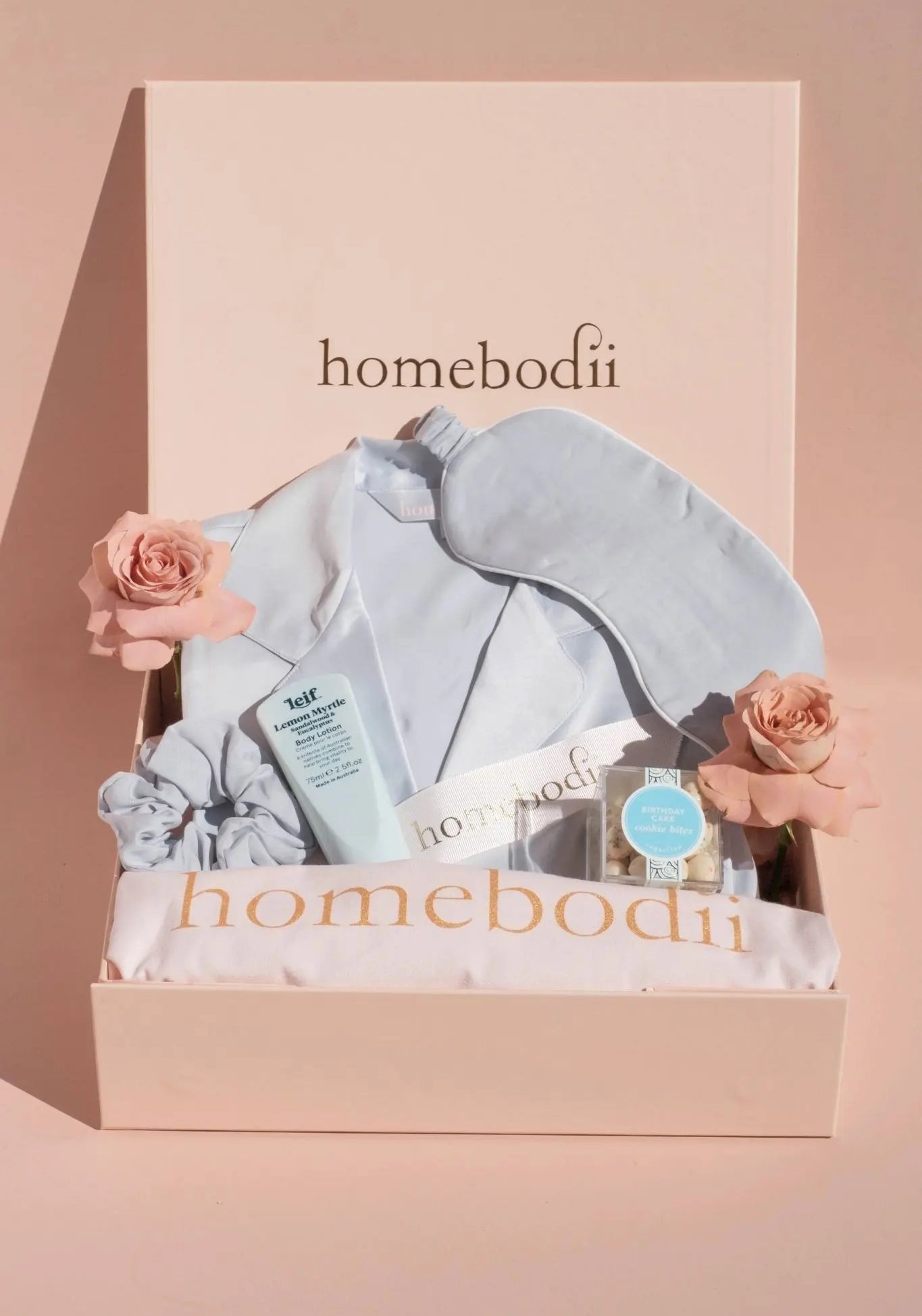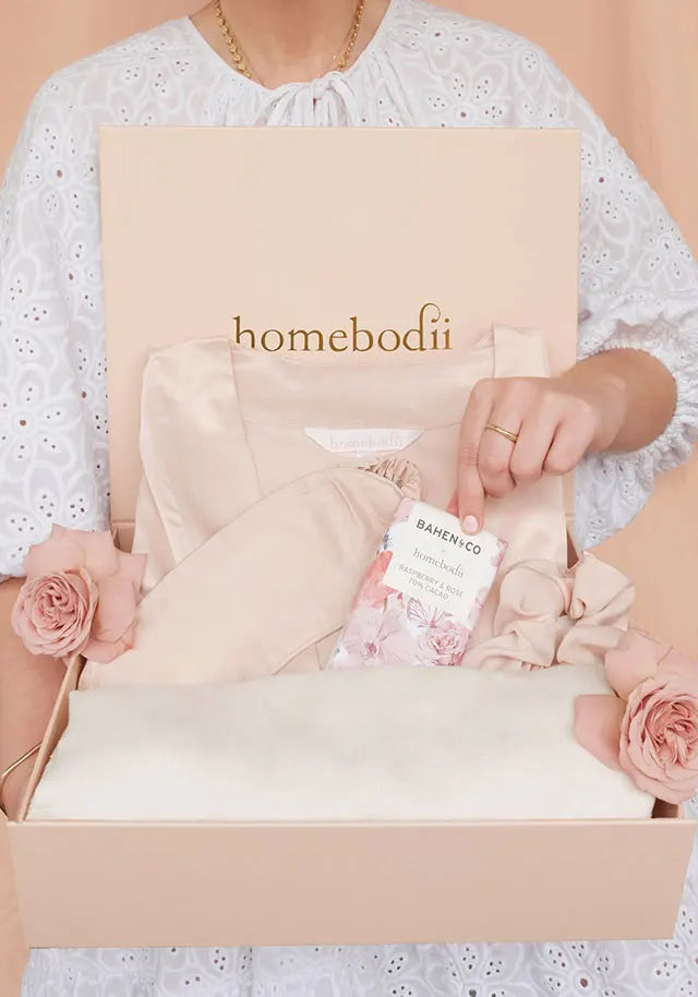 Our Take A Moment Hamper in blush with white or eggshell blue – your choice – is the perfect pampering self-gift this holiday season. Inside you’ll find everything you need for “me” time spent in your pjs, cup of tea in hand and nothing but relaxing on the agenda. Hamper includes a divine set of our matching Grace Satin Pyjamas, Homebodii x Byron Bay Glow Tea, Huskee Reusable Coffee Cup, Homebodii x Bahen & Co chocolate, and a handy tote bag.