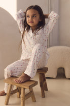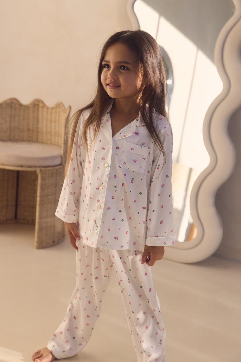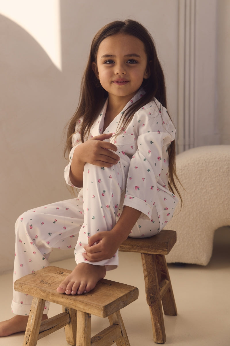 The Rosie Children’s Lounge Pyjama Set features a sweet rose print on a crisp white base, bringing a playful yet elegant touch to bedtime. The long sleeve button up top is finished with a notched collar and contrast piping, while the matching full length pants feature a gentle elasticated waistband for easy movement and all night comfort.