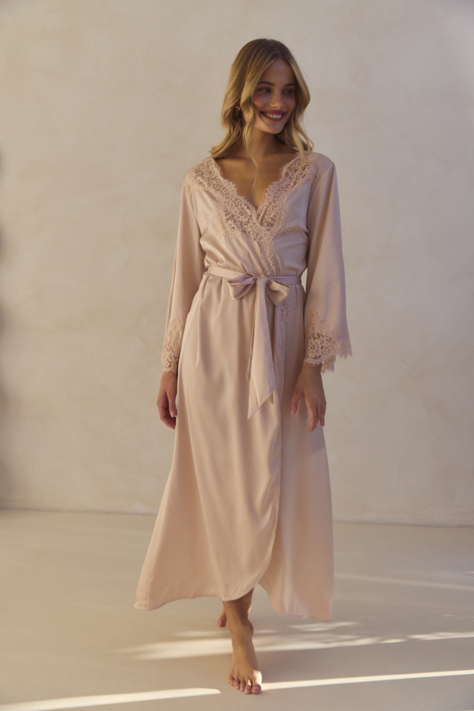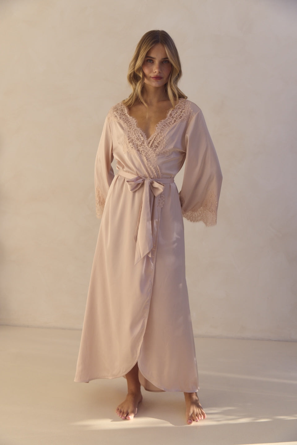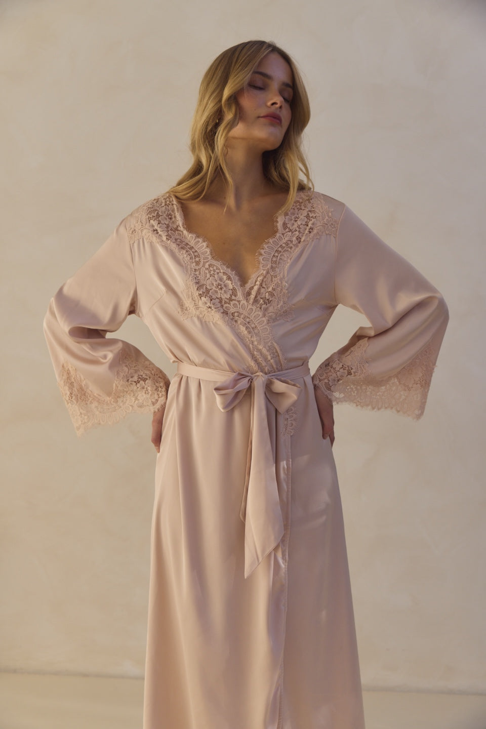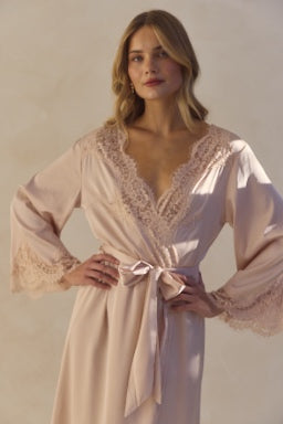 Indulge in the elegance and feminine allure of our Sian Lace Robe in blush. This luxurious and sensual robe is meticulously crafted from a combination of sumptuously soft satin and delicate black lace, ensuring both comfort and glamour.