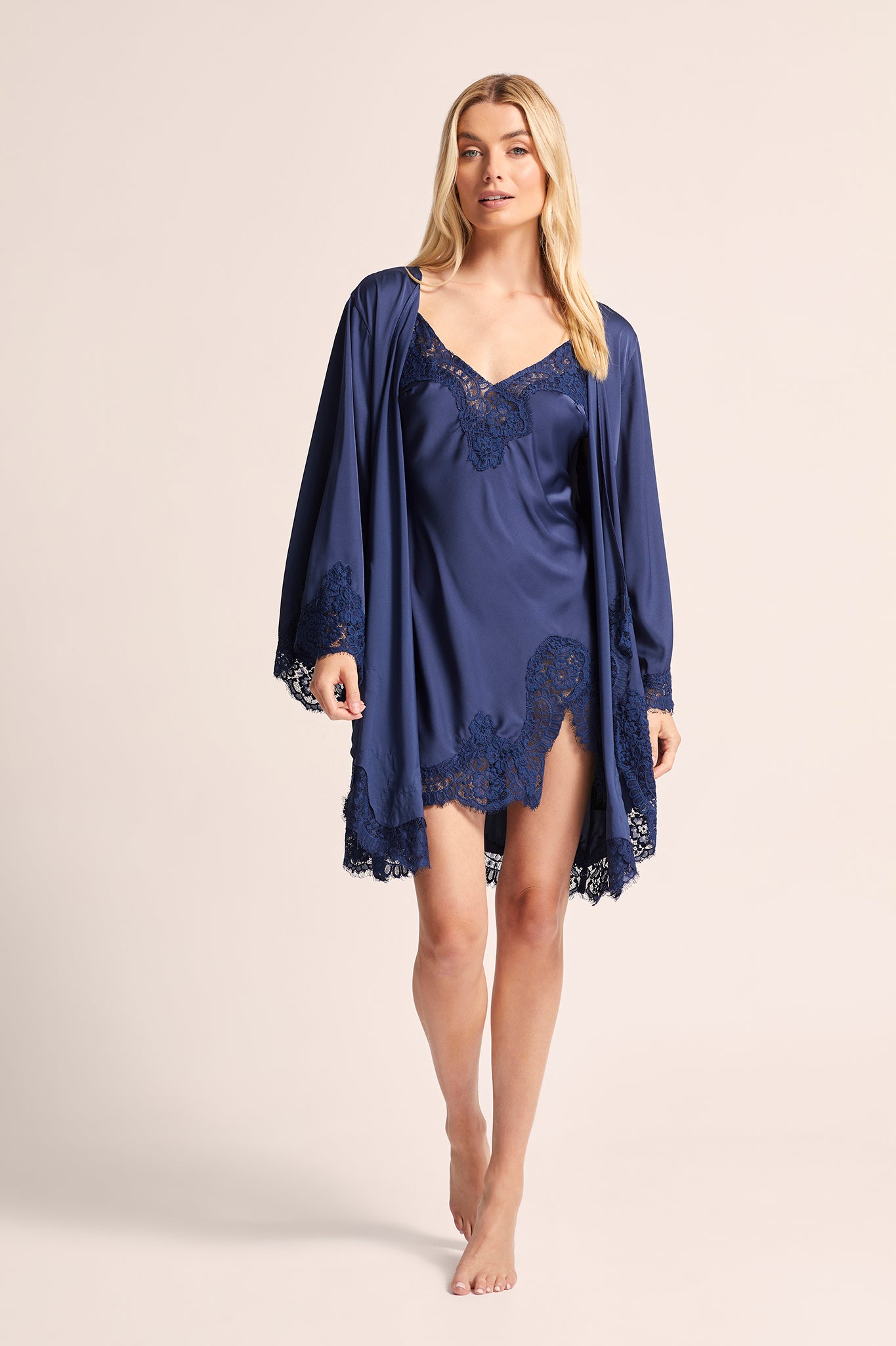Indulge in the elegance of our Sian Lace Slip, crafted from luxurious silky navy satin with a touch of stretch. The bias cut design hugs your curves beautifully, while adjustable spaghetti straps and a v-neckline, adorned with exquisite lace appliques, add sophistication.