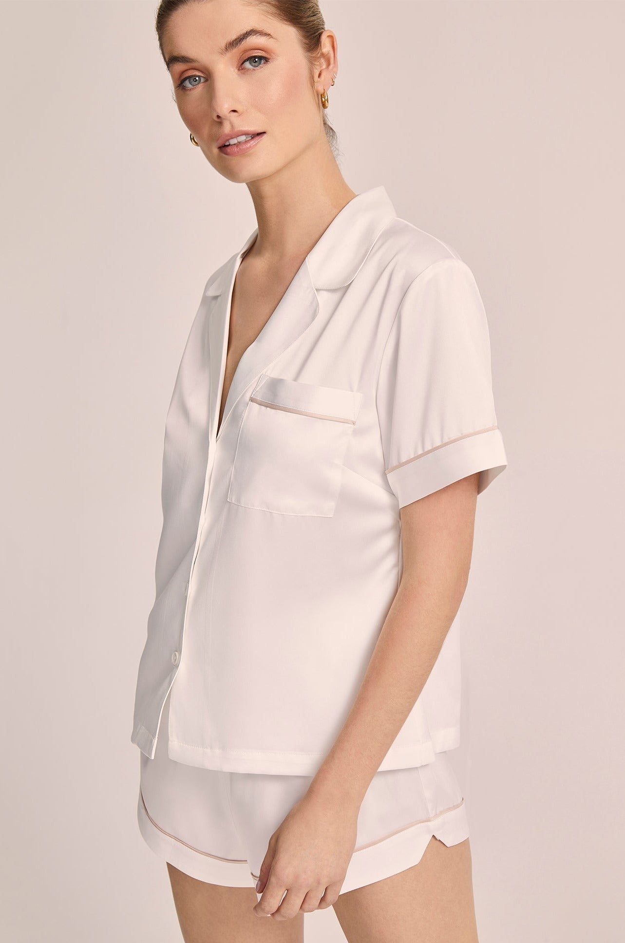 Adorned with self-colour satin buttons, this set is buttery soft on the skin and the comfortable elasticized shorts guarantee a night of the most peaceful sleep.