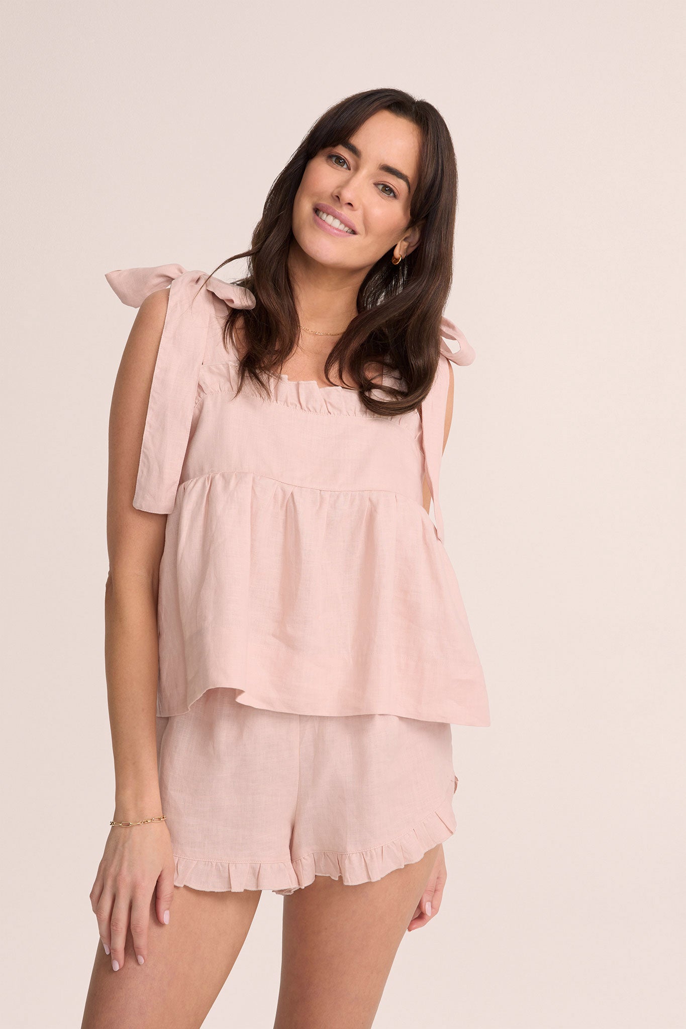 Introducing our exquisite Libby Linen Cami Set, featuring charming frills and removable bows on the shoulders. This stunning ensemble combines the timeless elegance of linen with delicate accents, offering a breathable and comfortable fit perfect for lounging or sleeping.