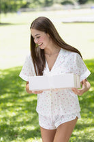 The Rosie Pyjama Set features a delicate rose print on a pristine white base, exuding timeless femininity. The short-sleeve button-up shirt includes a notched collar and chic piping detail, while the matching shorts offer an elasticated waistband for a relaxed and flattering fit.