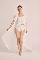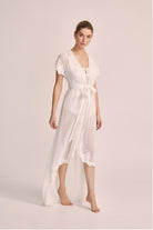 The short sleeves offer a light and breezy feel, making it ideal for warmer days or layering over your favourite sleepwear. Whether you're getting ready for a special occasion, enjoying a relaxing morning, or embracing a quiet evening, the **Valentina Robe** envelops you in luxury and style.