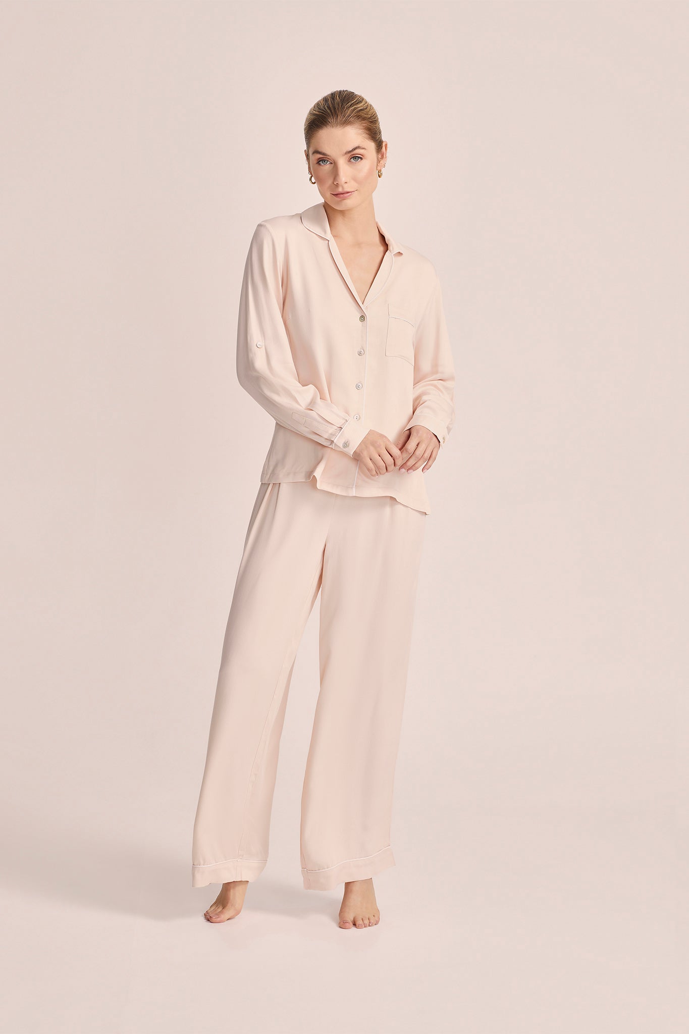 Meet Eva. Eva is a 100% sustainable, breathable, buttery soft set of matching short pjs with timeless piping trim. Not only is Eva beautiful to wear, she’s also kind to the Earth. Made from certified TENCEL™ material derived from sustainably harvested wood pulp and created using environmentally considerate processes, you and the planet will love our Eva pyjamas.