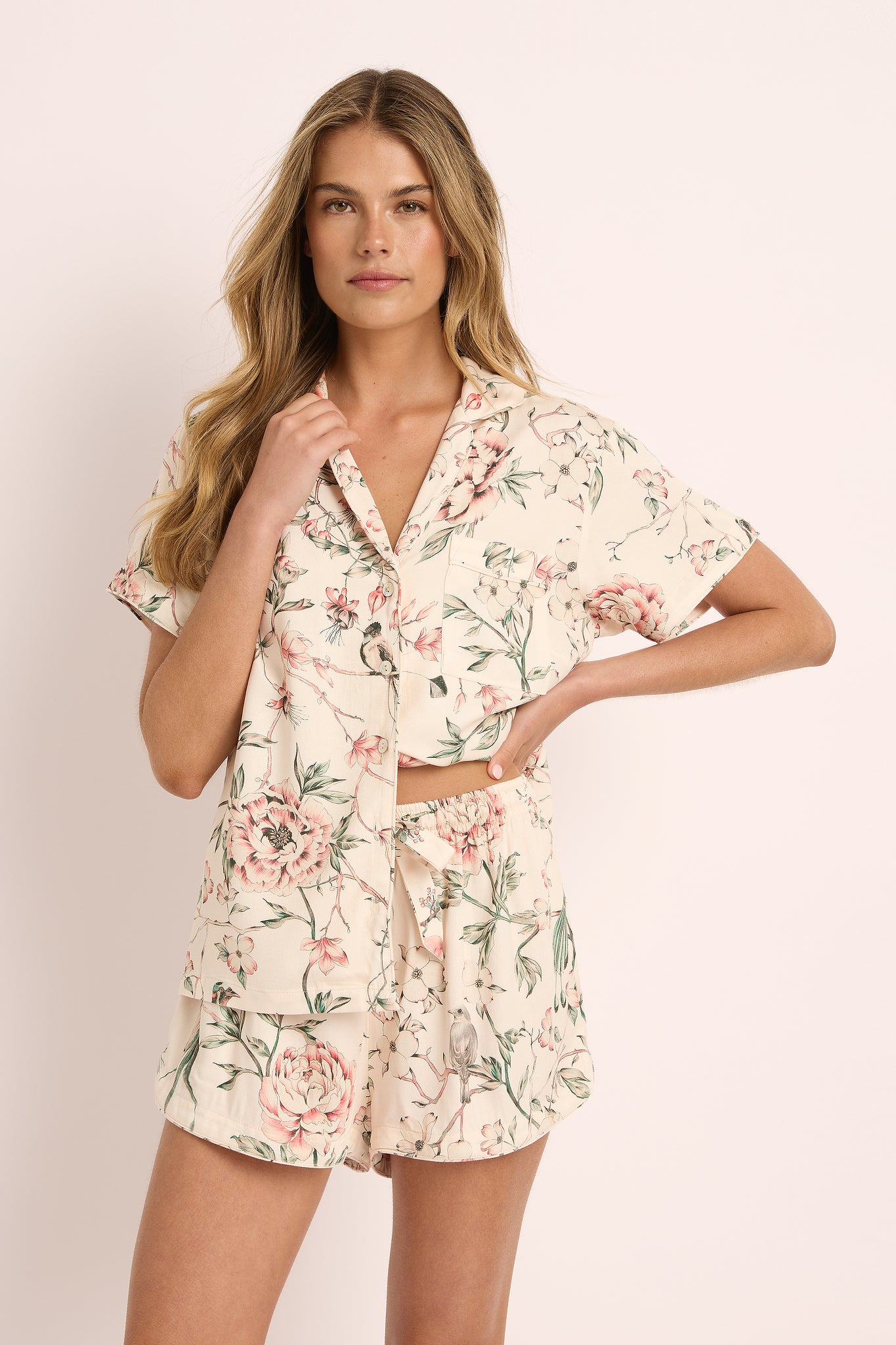 Our exclusively designed Botanica print in our pyjama lounge set is a beautiful balance between comfort and style. A luxuriously soft blush colour featuring a floral & bird print.