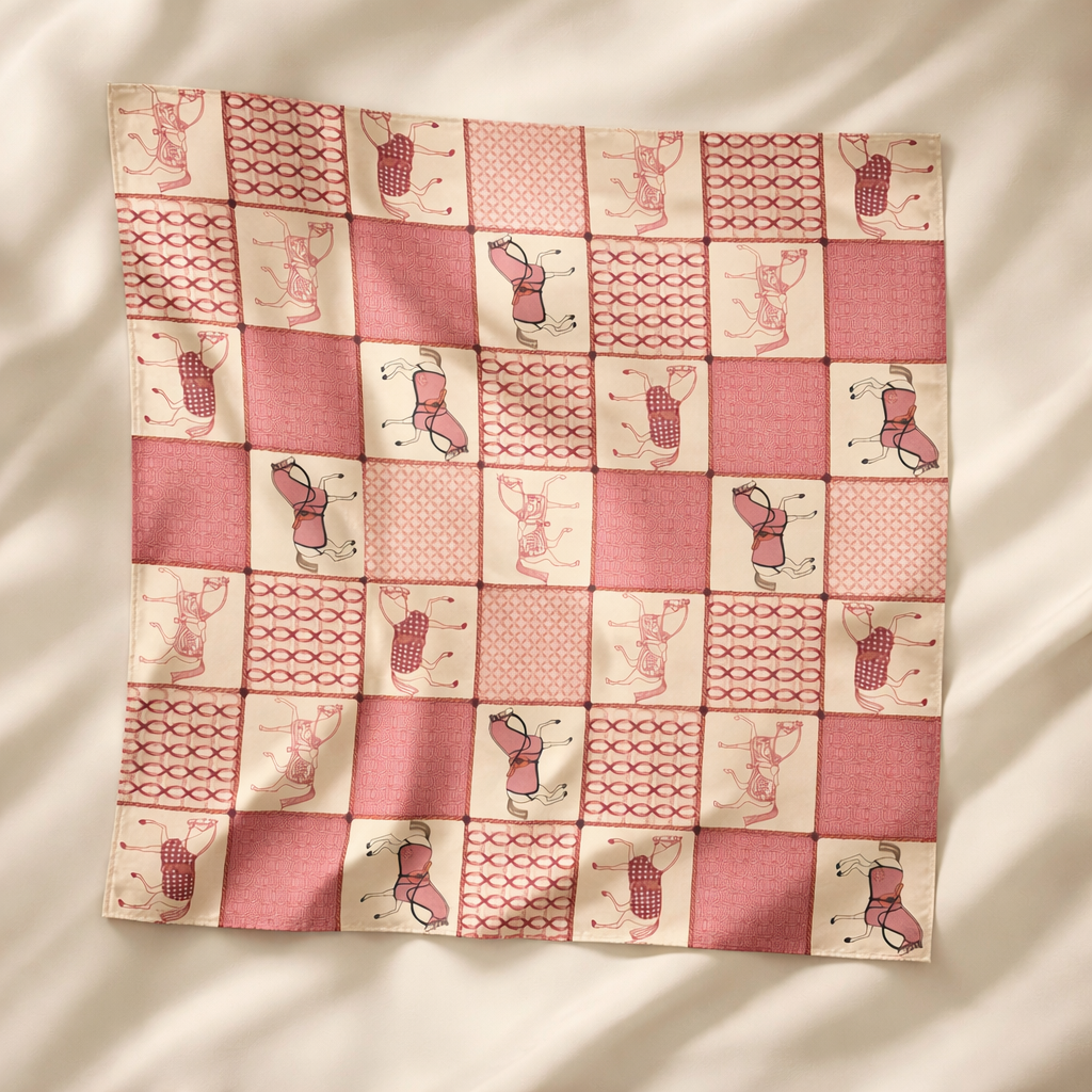 Playful yet refined, this patchwork scarf is designed to elevate everyday styling with a sense of whimsy and charm. Featuring a beautifully balanced grid of blush, rose, and soft cream tones, each square tells its own story through delicate equestrian-inspired illustrations and graphic patterns.