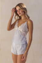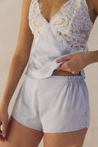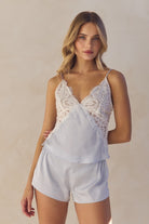 The cami top features delicate lace detailing along the neckline, adding a romantic touch, while adjustable straps provide a tailored fit. Paired with matching satin shorts,  this set is designed for both comfort and elegance.