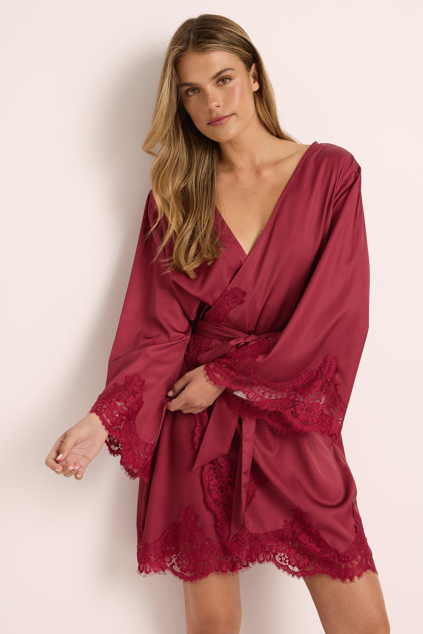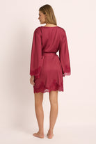 Introducing the Sian Lace Robe, an opulent and enchanting robe that promises to leave a lasting impression. Meticulously fashioned from sumptuously soft satin and delicate lace, this robe is expertly designed to enhance your natural curves, thanks to its cinching waist tie and form-flattering silhouette.