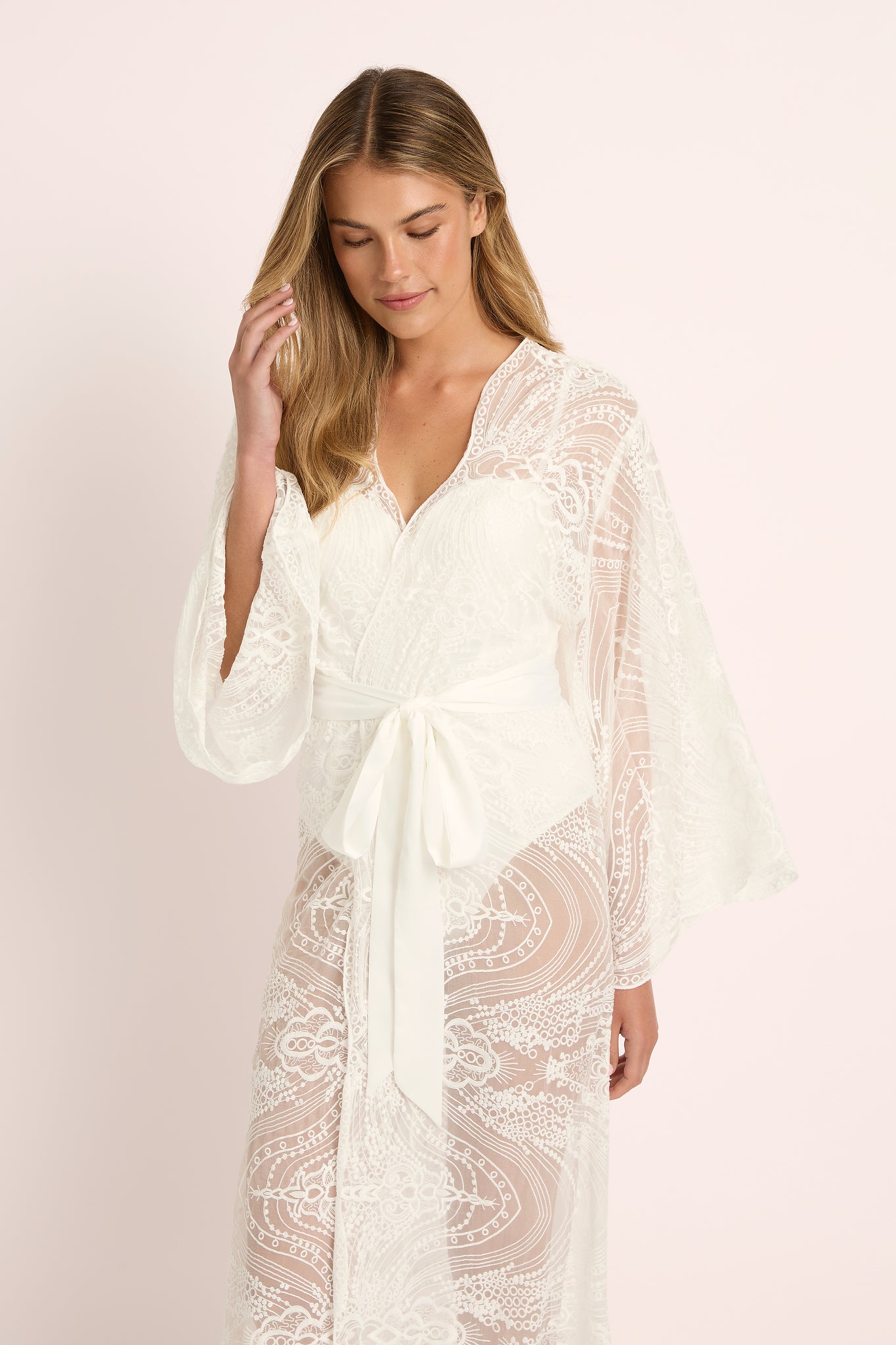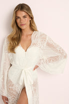 The soft silhouette drapes effortlessly across the body, with flowing kimono-style sleeves and a luxurious satin sash that cinches the waist for a flattering finish. The intricate lacework dances in the light, creating an elegant play of texture and transparency — a true celebration of detail and design.