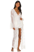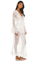 Crafted with delicate, bohemian-inspired lace details from our Miami L'Amour collection, the Madonna Robe captures the essence of romance and elegance. The intricate lace designs leave no detail unthought of, creating a stunning statement piece for luxurious lounging and artful self-care. At 135cm floor-length, it drapes beautifully for dramatic elegance. Whether you're preparing for your wedding morning, enjoying your honeymoon, capturing boudoir photos, or relaxing at a beachside getaway, this robe ensures you feel extraordinary.