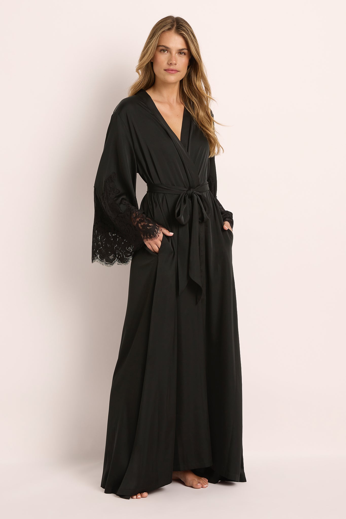 Exquisite lace detailing adorns the sleeves and hem, adding a touch of romance and refinement. With a flowing silhouette and a self-tie waist, this robe offers both comfort and a flattering fit, making it perfect for slow mornings, relaxing evenings, or layering over your favorite Homebodii pieces.