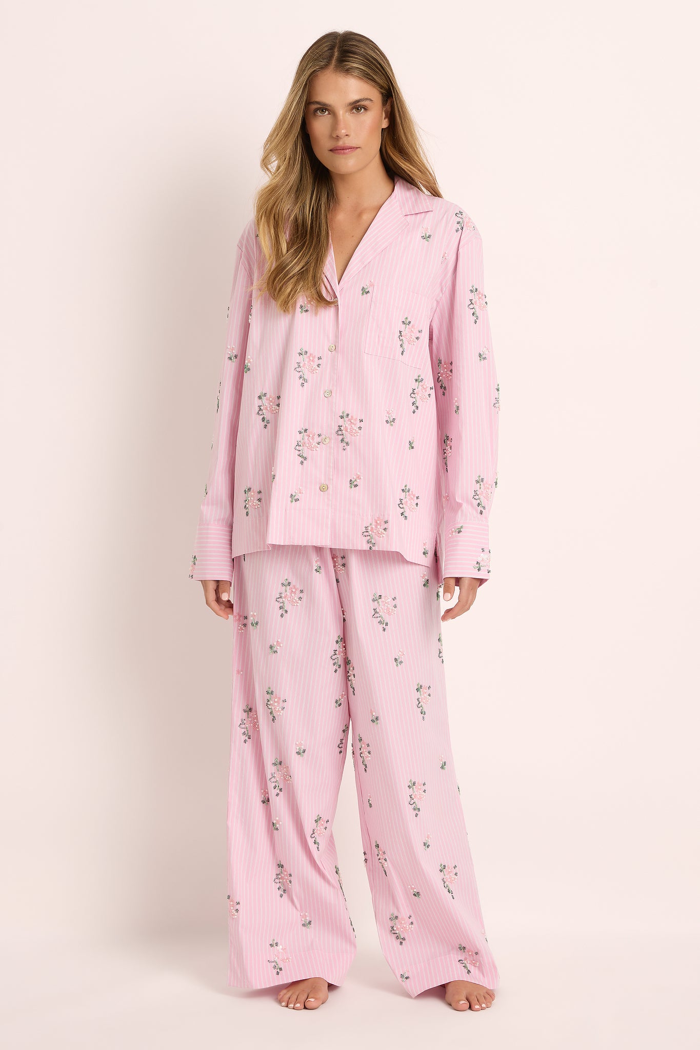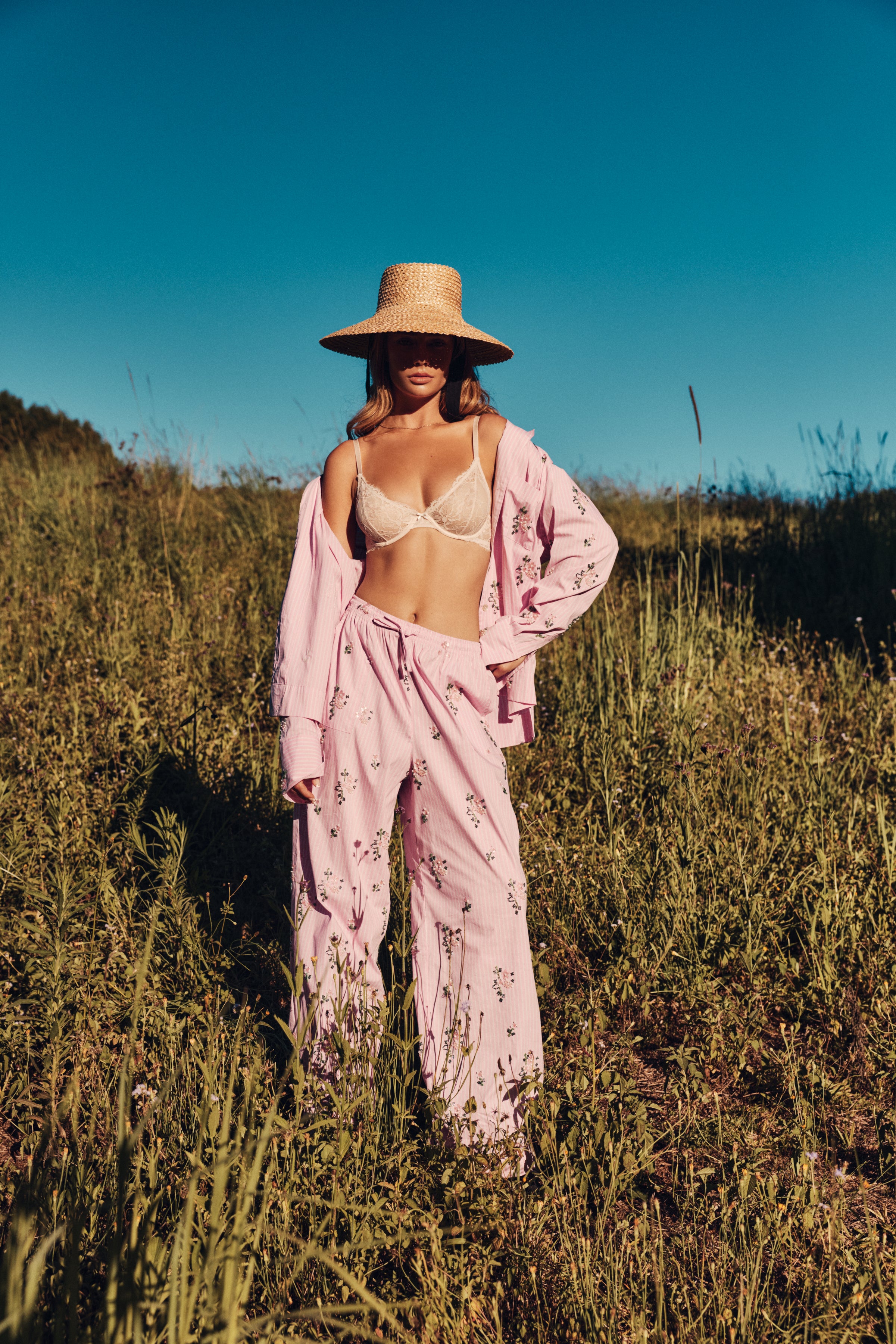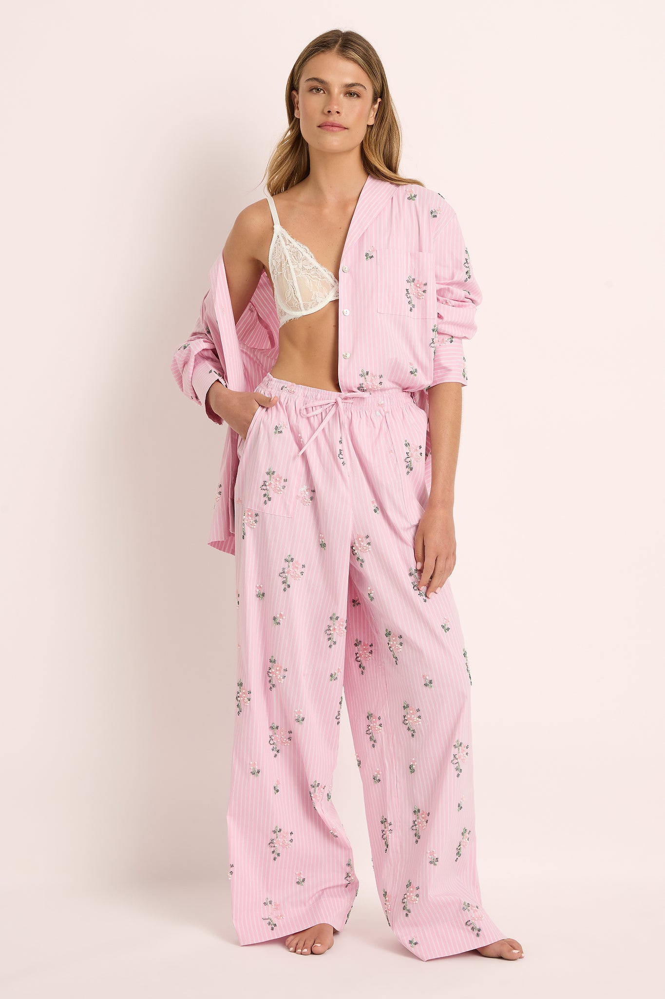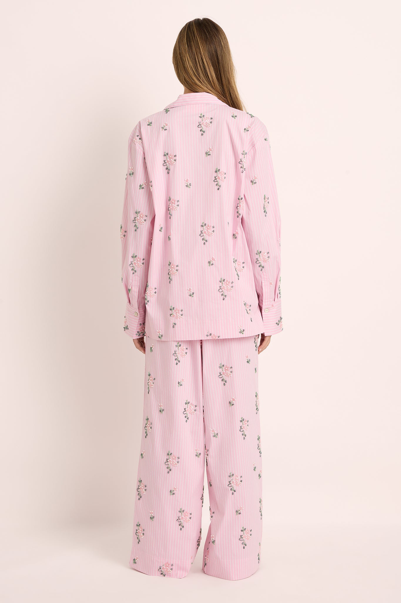 Each detail from the romantic floral motifs to the subtle shimmer of beadwork — celebrates artistry and grace. The relaxed button-up shirt and wide-leg pants offer a fluid, flattering silhouette designed to move beautifully from at-home lounging to sophisticated daywear.